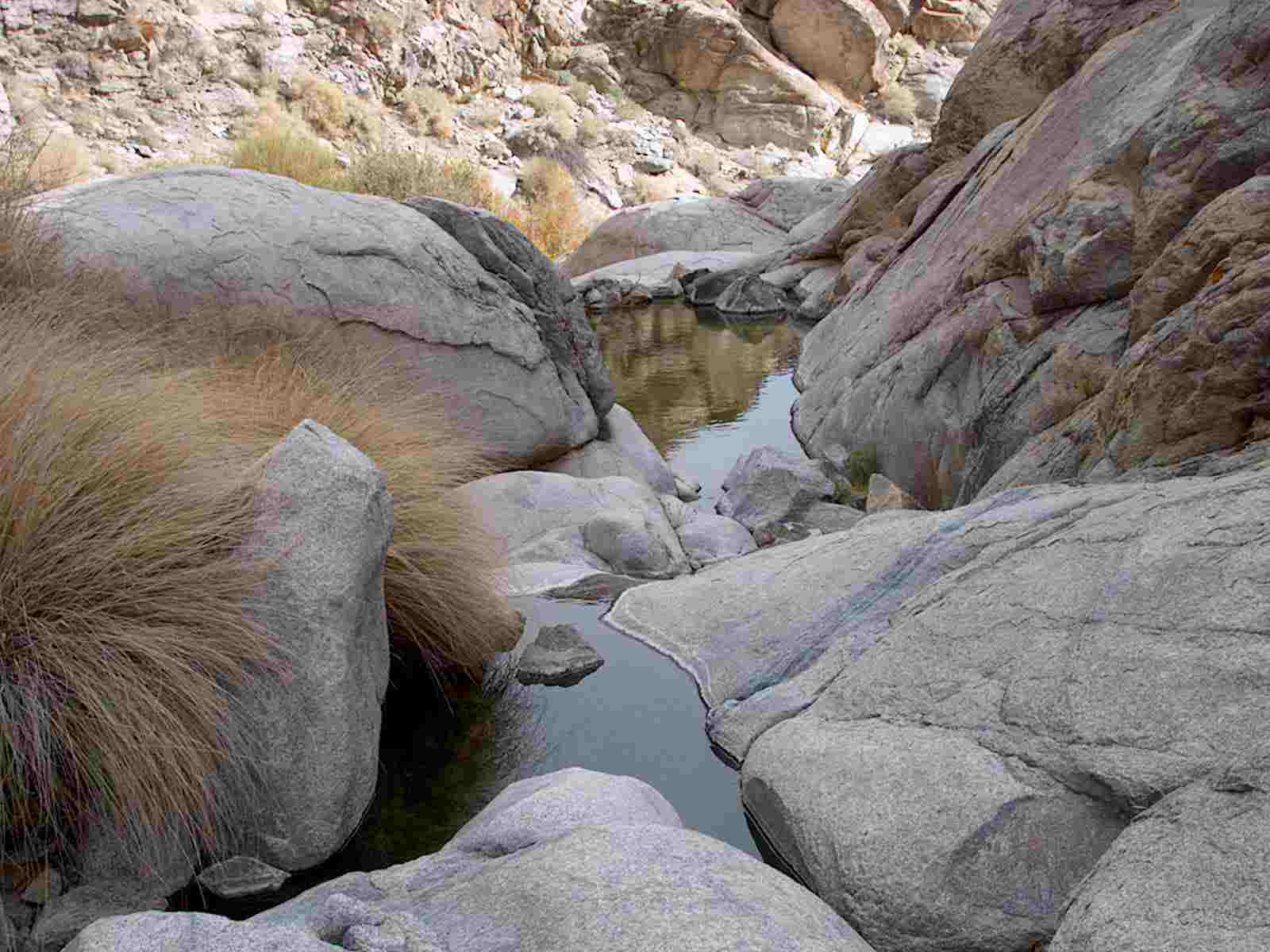 In springtime a stream from springs on the east side of Argus Peak flows through a high-walled canyon, tumbling over four falls up to 25 feet high, before sinking into the sand as it exits the canyon. |
