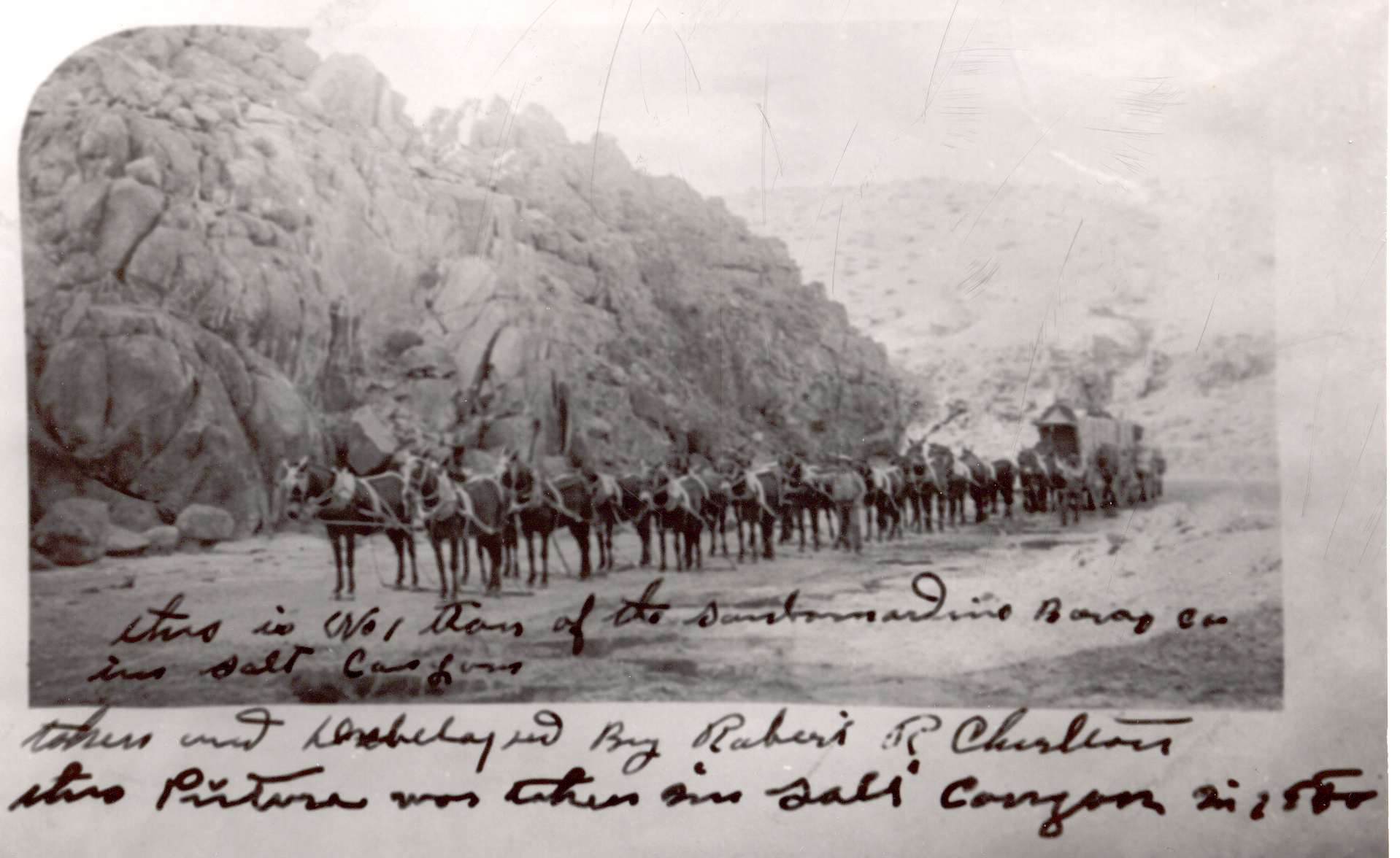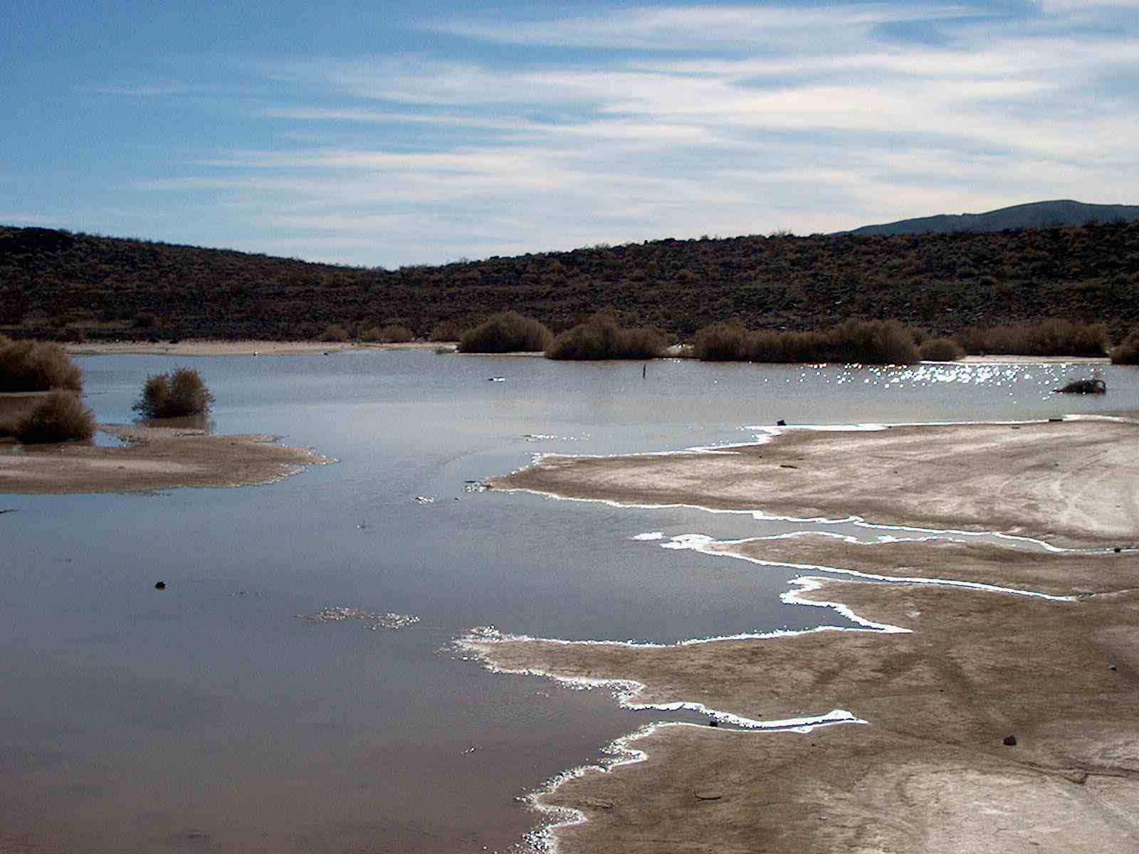 (POISON CANYON) Salt Wells canyon is commonly called "Poison Canyon" because the small stream at its west end contains naturally occurring arsenic, selenium and other minerals at toxic levels. This rock-walled canyon is the lowest point in the Indian Wells Valley basin. Therefore, it was the channel for the ancient Owens River as it flowed east during the melting of Sierra Nevada glaciers. When Searles Valley was filled with water, deep mud deposits filled this canyon. When the lake evaporated, much of the mud was washed out of the canyon by flash floods. Residual mud deposits can still be seen along the sides of the canyon and at the canyon's eastern end. On the North side of the canyon near its east end is "Fish Head Rocks." Best-viewed looking east, they were originally called the "Whale Heads." The canyon was the route of the original 20-mule teams that hauled borax from Searles Lake to San Pedro. |