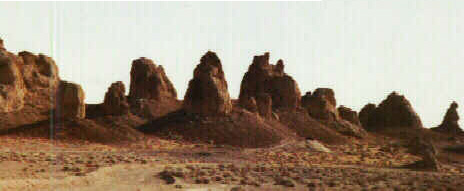 This striking group of over 500 calcareous tufa towers is located about 12 miles south of Trona. This National Natural Landmark is accessible by a 5-mile dirt and mud (that is hazardously soft in wet weather) road from the end of State Highway 178. These tufa towers were formed by calcium-bearing ground water from springs beneath ancient Searles Lake flowing up through the alkaline lake waters. |