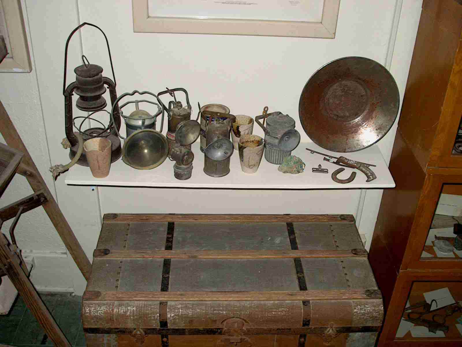 This picture shows some old acetylene miners lamps, a kerosene lantern, a gold pan, assay crucibles and an old trunk. The acetylene miners lamps had a lower chamber filled with calcium carbide and an upper chamber containing water. When water was dripped onto the calcium carbide, they reacted to make the acetylene gas that would burn in the air with a luminous flame. |