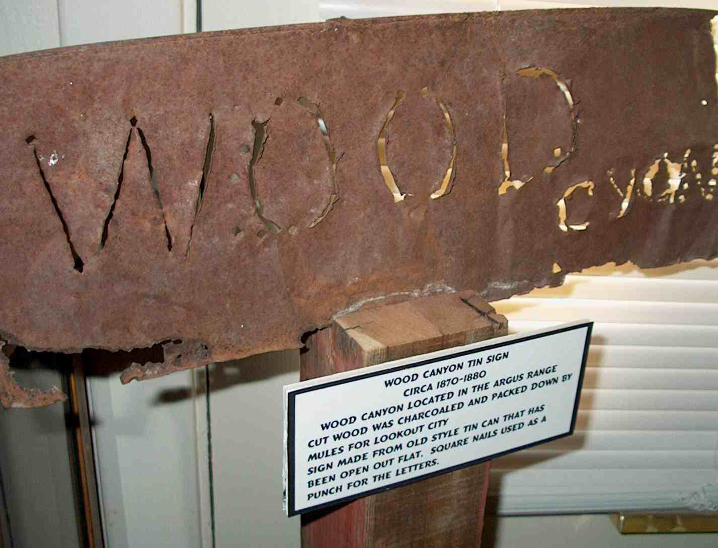 This hand made sign dates to around 1870-1880. It was made from an old style tin can that had been opened and flattened. The letters were punched in the tin to make the sign. The sign identified Wood Canyon in the Argus Range. Wood from this canyon was made into charcoal that was packed by mules to the mines at Lookout City. |