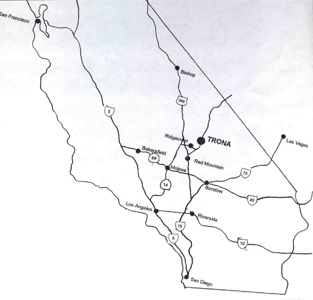 Take State Highway 14 north through Lancaster and Mojave to the turn east (right) on State Highway 178 toward Ridgecrest. Continue east on SR 178 through Inyokern and Ridgecrest and continue on SR 178 to Trona. See California map below. From Victorville, San Bernardino, Orange County and San Diego