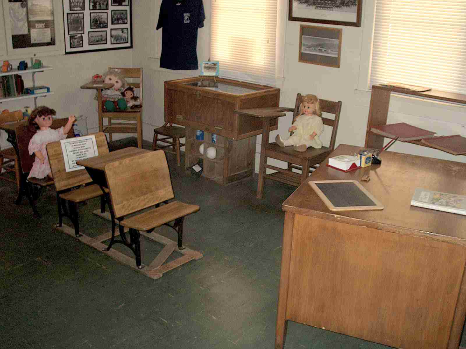 The room contains a set of old fashioned desks, anchored together on runners to keep them "properly" separated. There are also many photographs of the Trona Schools. |