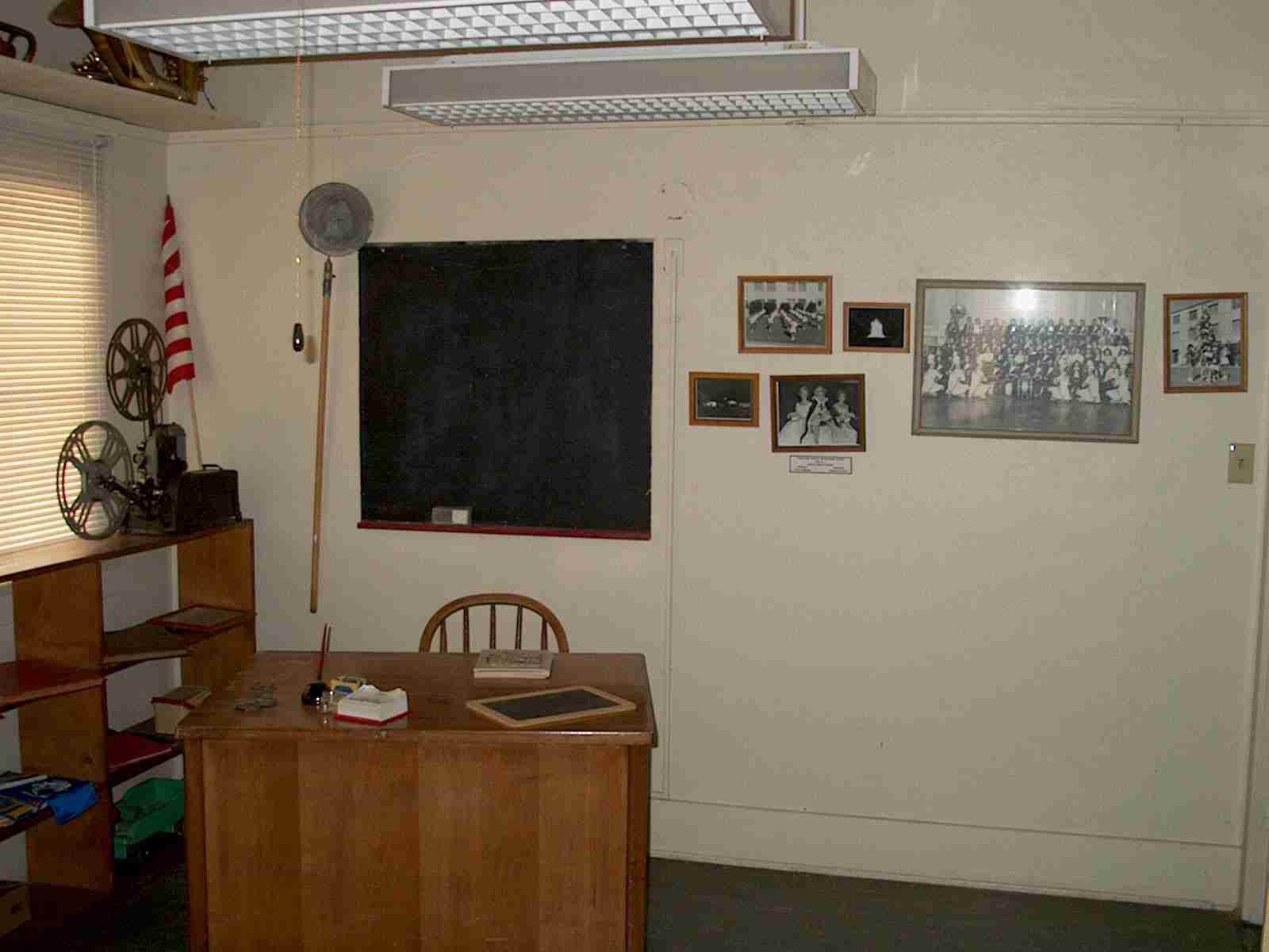 There is an old desk in the room. You can almost feel the presence of the teacher. Also displayed is a "modern" 16 millimeter movie projector for student visual aids. |
